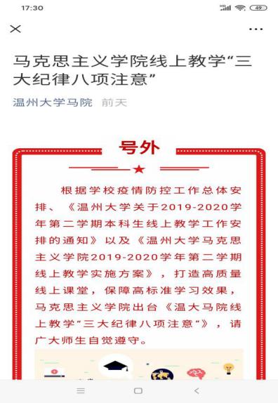 疫情防控期间,根据教育部、亚洲无码 等相关文件精神,亚洲无码 马克思主义学院充分利用线上教学平台、现代教学技术和优质在线课程资源,全面启动新学期线上教学与管理工作。本学期共有思政课涉及全校16个学院的104个教学班。按照“停课不停教不停学”的总体要求,温大思政课全面开启“三全”线上教学:战“疫”在线“主播”思政全覆盖、战“疫”专题思政第一课全新讲、战“疫”在线思政课程全共享。