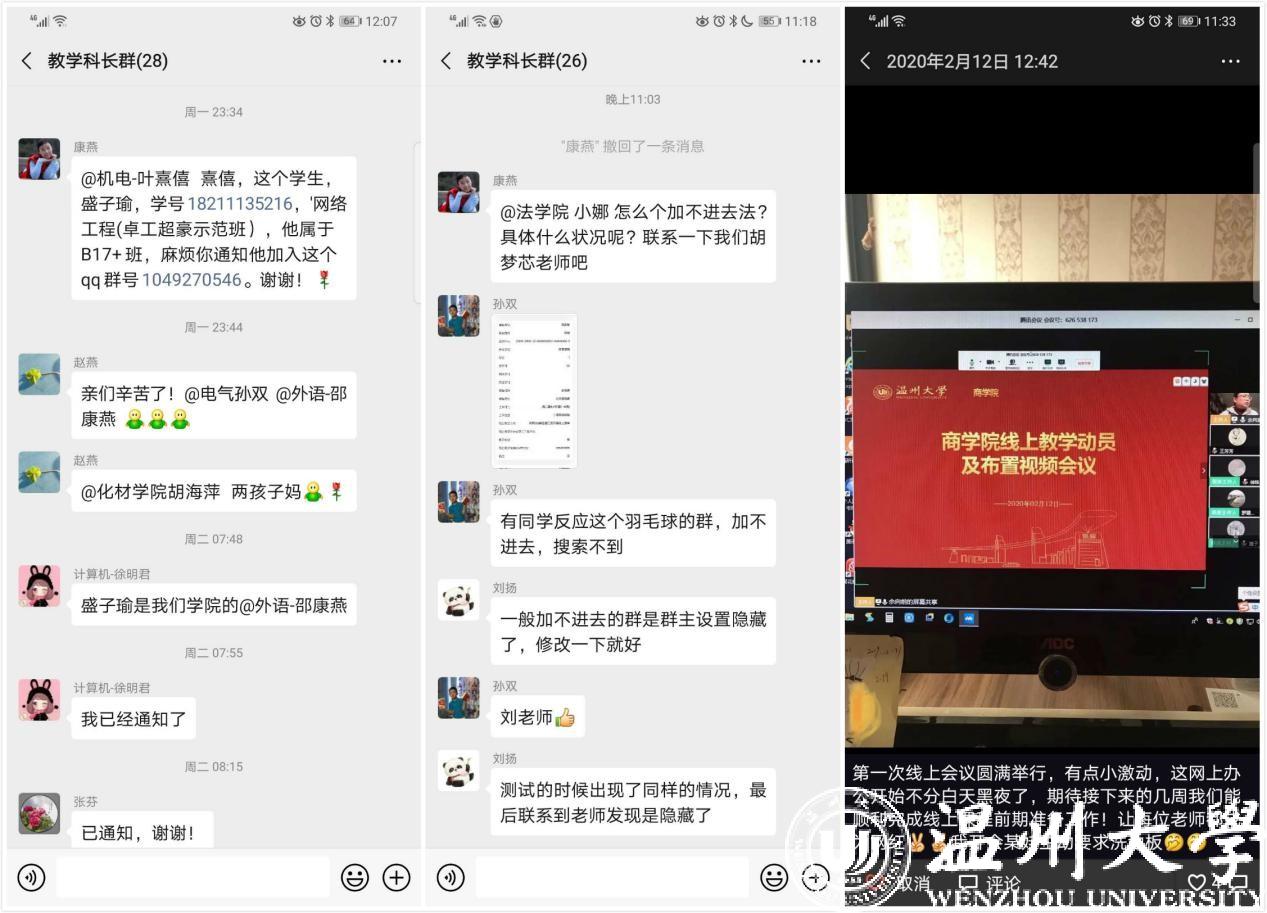 各学院教务科管理员们认真负责、夜以继日地在课程建设、平台运行、信息汇集、师生沟通、学生选课等方面提供服务。计算机学院徐明君、胡孙贵按照精细化办公原则,每日收集线上教学师生反映的问题,日报线上领导小组,周报学院老师,助力在线教学顺利开展;外国语学院邵康燕、胡梦芯积极落实大学外语课程线上免修工作细节,为课程改革与创新提供服务;商学院徐姝、人文学院伍海燕、电电学院孙双、教育学院刘荣建、机电学院叶熹僖、音乐学院徐国军等实时解答学生转专业、学籍异动、选课等各类问题,时常工作到凌晨;美术学院黄呼尔励、体育学院潘帆、程丽珍、数理学院张芬、龚平娟、化材学院胡海萍、建工学院林彩芬等人帮助跨院师生建立沟通交流渠道,全力以赴支持正常的教学运行,实现“上课学生一个都不能少”。