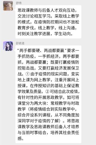 为贯彻落实习近平总书记关于新冠肺炎疫情防控工作的重要讲话和指示精神,全力支持配合打赢疫情防控人民战争、总体战、阻击战,深化新时代高校思政课改革创新,按照教育部党组“停课不停教、停课不停学”的工作要求,我院充分利用线上教学平台和优质在线课程资源,全面开启战“疫”在线“主播”思政全覆盖、战“疫”专题思政第一课全新讲、战“疫”在线思政课程全共享的“三全”线上教学活动。