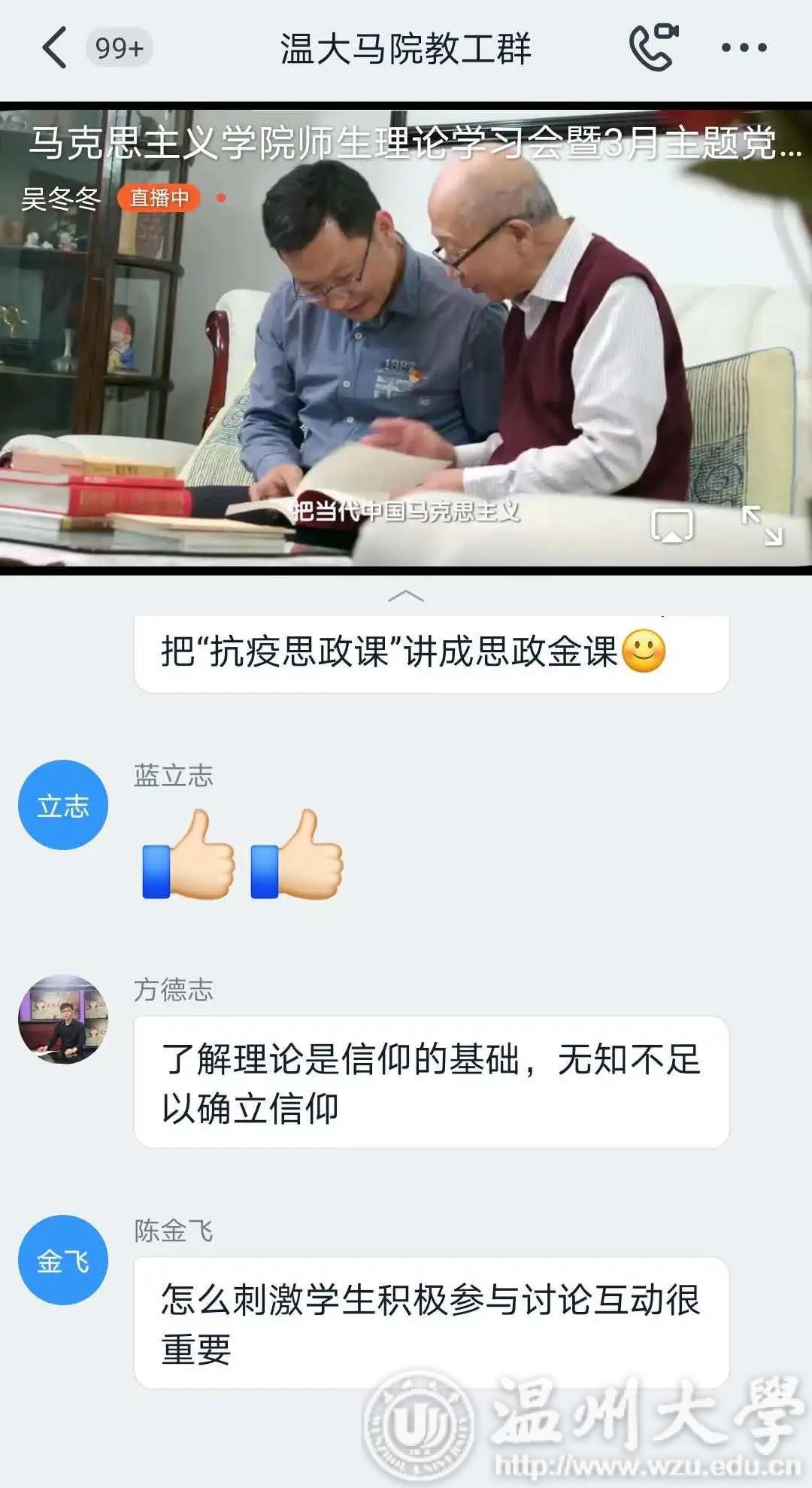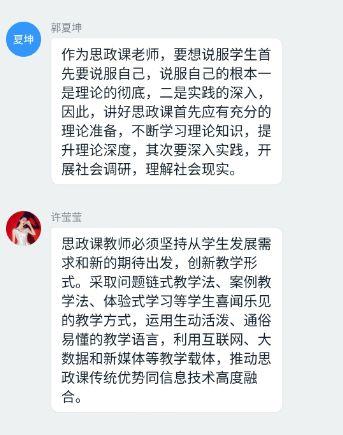 观看结束后,各个党支部随即进行了线上交流。各位党员同志结合《一堂思政课》的内容和自己所学专业,围绕“如何做好思政课教师” “如何上好思政课、发挥思政课的作用” “如何培养思政课教师后备人才” “当前思政课教学如何落实好’两手都要硬、两战都要赢’的重要精神” 等问题发表了自己的看法和心得体会。