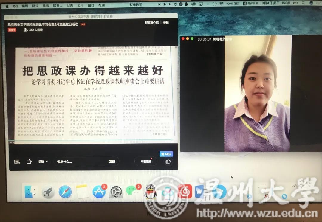 同时,为贯彻落实习近平总书记在学校思想政治理论课教师座谈会上的重要讲话,增强思想政治理论课的思想性、理论性、针对性和亲和力,并结合学校组织部统一部署,学院在3月4日下午以“不见面”形式集中开展理论学习会暨“抗疫情、促发展、当先锋”支部主题党日活动,集体观影《一堂思政课》,深入开展新时代思政课改革创新大讨论活动。