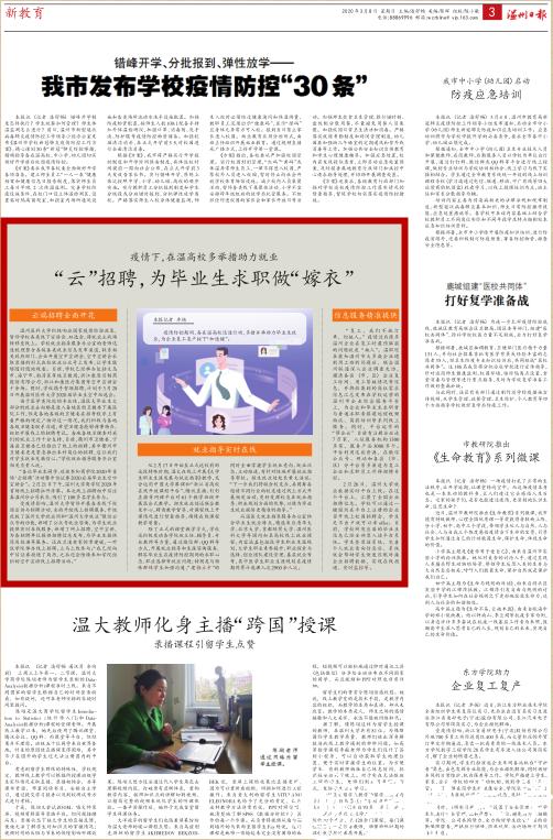 从2月17日开始至正式返校前的这段特殊时期,温大在线上开展《大学生职业生涯发展与就业指导》教学,充分运用中国大学幕课和“浙江省高校在线开放课程平台”、腾讯直播、钉钉直播等网课平台对61个教学班级开展混合式教学。招生就业处还联合教发中心,聘请教学督导,对课程线上开课情况进行督查指导,确保在线课程教学质量。