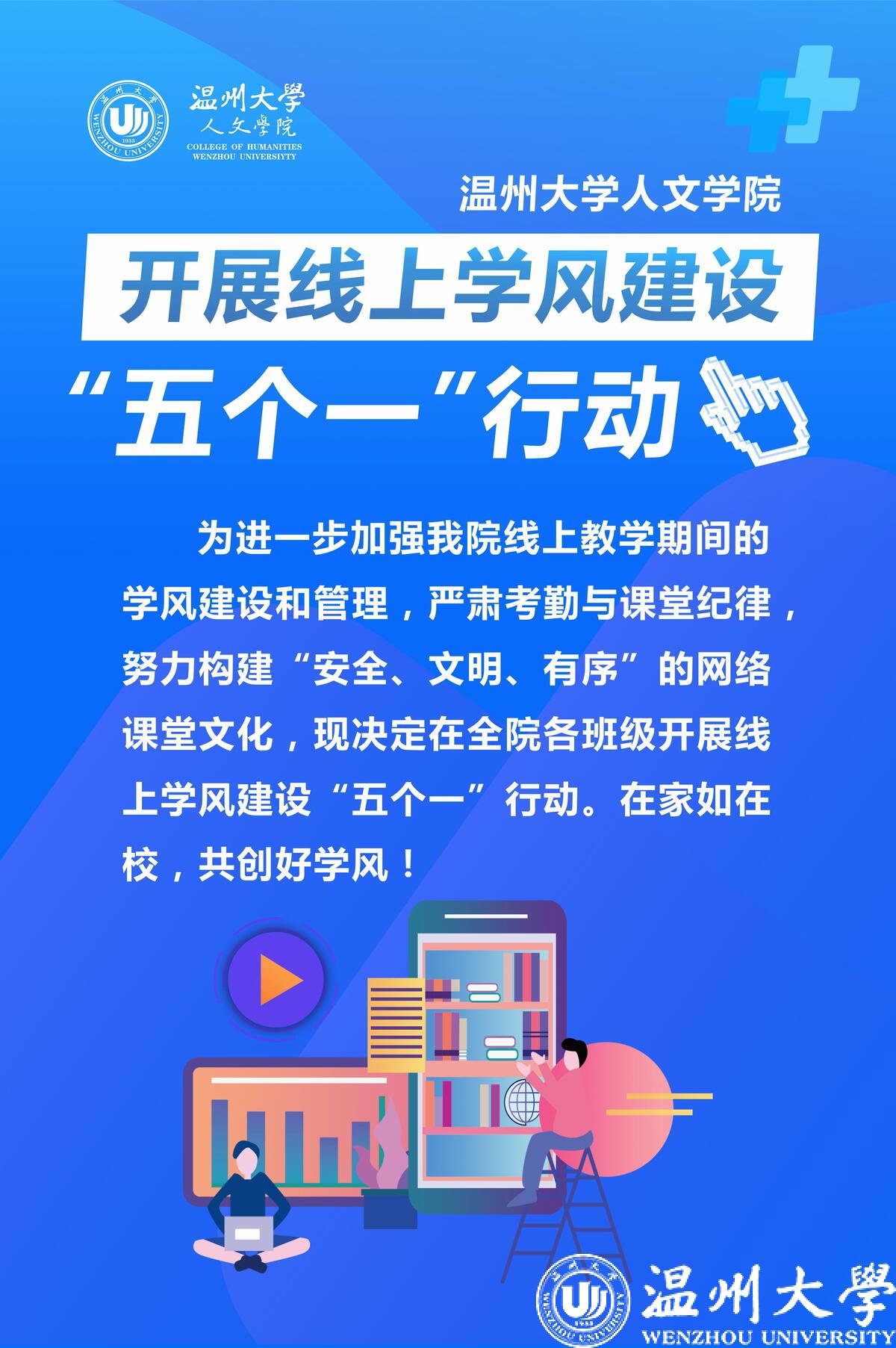 一个倡议:由学院团委·学生会发起“你我共同维护线上学习优良学风”的倡议书。号召全院学习积极加入“五个一”行动,共同维护当前线上教学环境下的优良学风,彰显优秀学子风采。