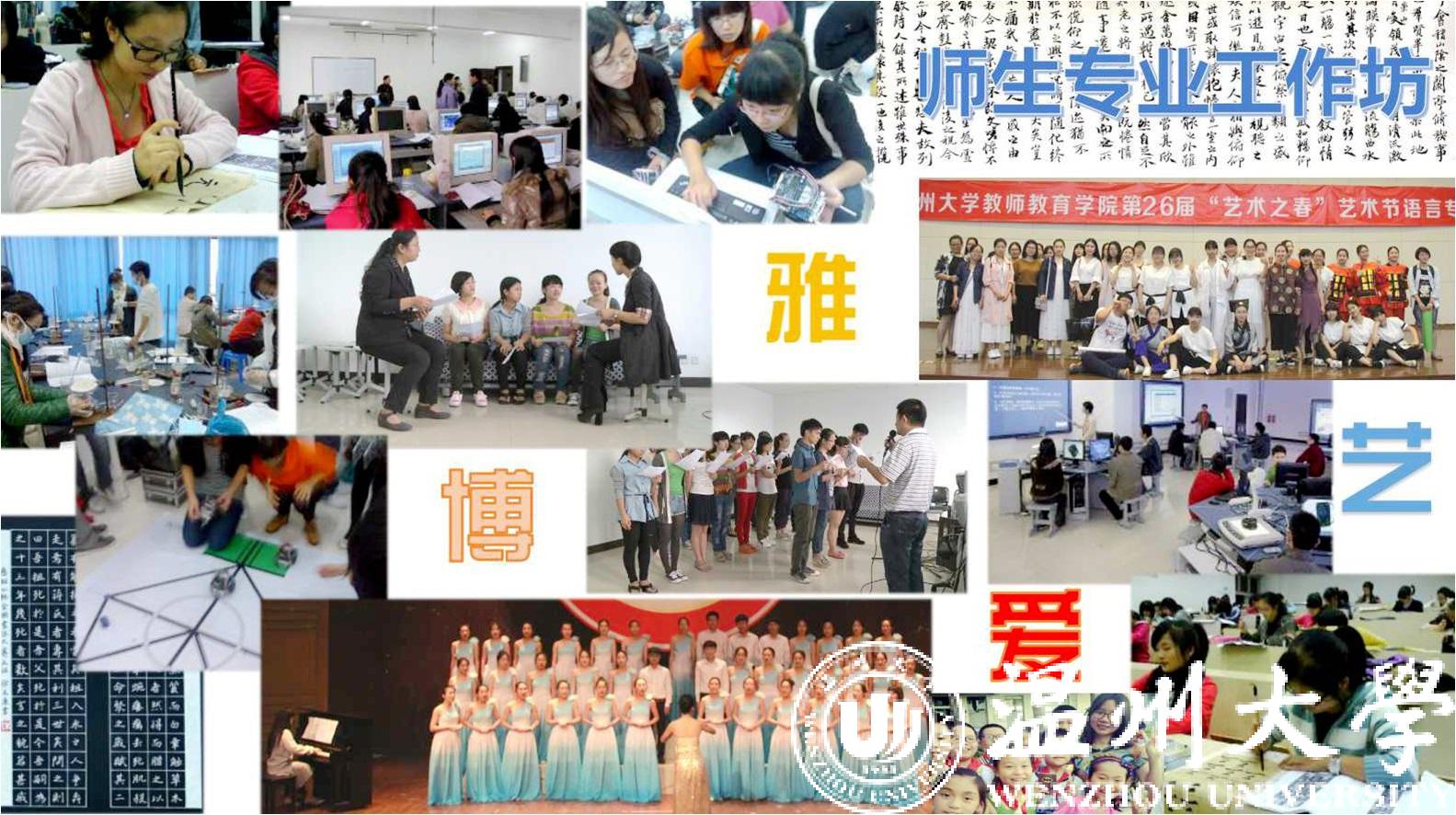 结合学科竞赛与专业活动打造的“师生专业工作坊”,也是温大教育学院师范生实践教育的一张金名片。语言、书法、演讲、文学创编、儿童剧社等师生专业工作坊既培养了学生兴趣爱好和健康个性,又充分体现了“师生专业学习共同体”育人自育的特点。