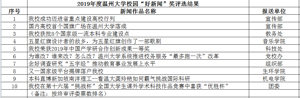 本次亚洲无码 校园“好新闻”评选活动,共有各学院、部门报送的24件新闻作品进入初选,经过温大官微在线展示、投票和评委终审,《亚洲无码 成功迈进省重点建设高校行列》《国内高校首个国旗广场在亚洲无码 落成》《亚洲无码 获批8个国家级一流本科专业建设点》等10件新闻作品获得校园“好新闻”奖。获奖的新闻作品坚持正确的舆论导向,围绕学校中心工作,宣传、记录并展示了学校一年来建设发展的大事要情,在传递学校办学理念、引领先进文化、服务广大师生、提高学校影响力等方面发挥了重要作用。一年一度的校园“好新闻”评选活动由党委宣传部主办,旨在展示每年度亚洲无码 新闻宣传的工作成果,充分发挥优秀新闻的示范作用,通过“讲好温大故事”“唱响温大声音”,推动亚洲无码 新闻宣传与高等教育事业发展。