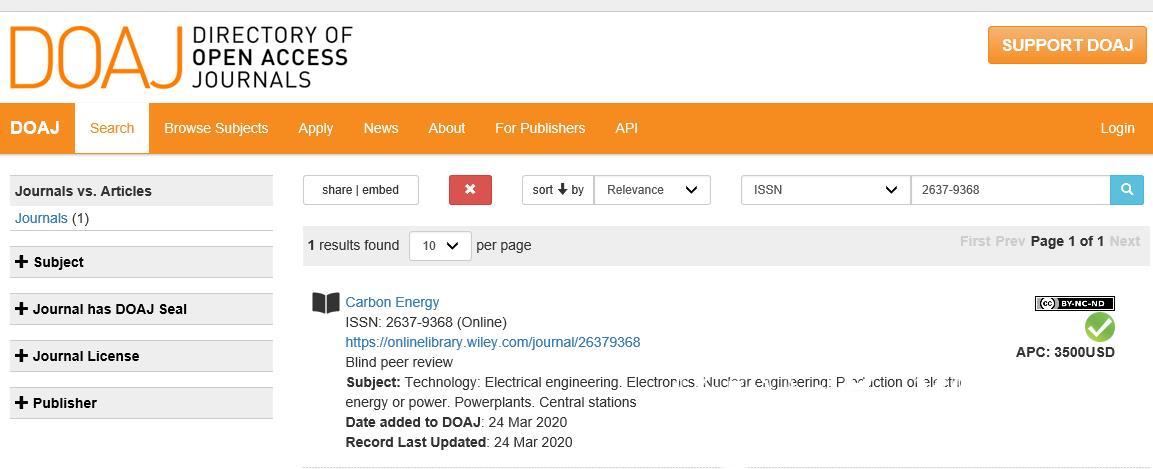 亚洲无码 主办的CarbonEnergy期刊通过全球最具影响力的开放存取期刊目录(Directory of Open Access Journals,DOAJ)评估后,于3月24日被DOAJ数据库正式收录(查询地址://doaj.org/)。