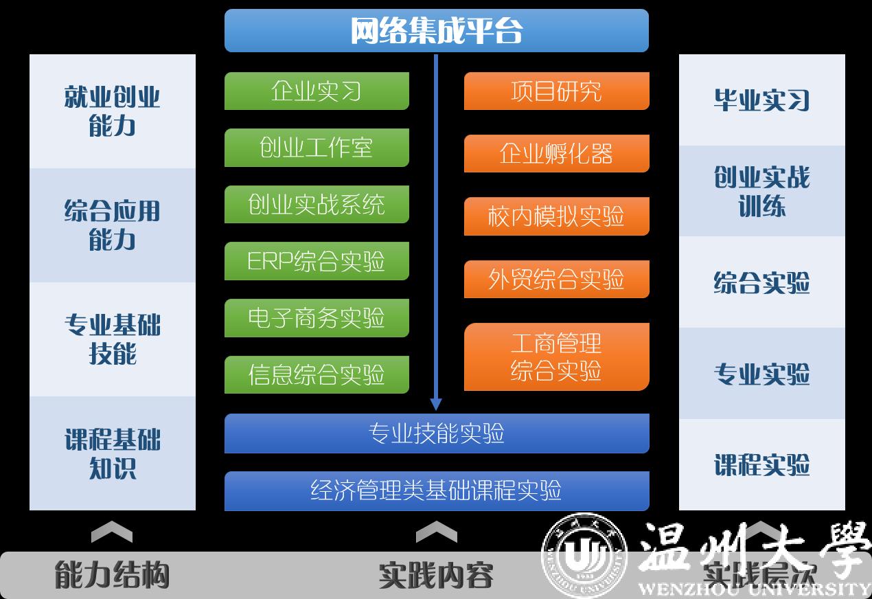 国贸专业利用校内外的实践基地和互动的教学团队,依次从课程实验、专业实验、综合试验、创业实战训练和毕业实习五个层次,帮助学生掌握课程基础知识,提升学生的专业技能、综合应用能力和就业创业能力。为了支撑该实践体系的运行,国贸专业建设了省级实验教学示范中心。 校内配备了进出口业务模拟实验室、金融实验室、银行模拟实验室、商务谈判模拟室等7个实验场所,可以模拟职业真实场景;更有融商创客空间与优秀的创业导师团队,为学生提供创新创业的平台。同时联合校友企业建立了20个校外实践基地,打造理论与实践相结合的实践环境。校内外共同构建成开放式、共享式、渐进式的“五层次”实践教学体系。