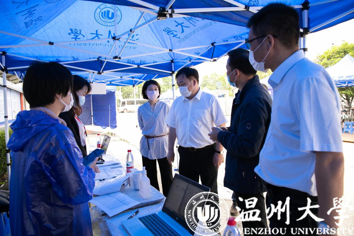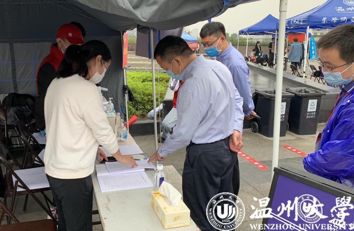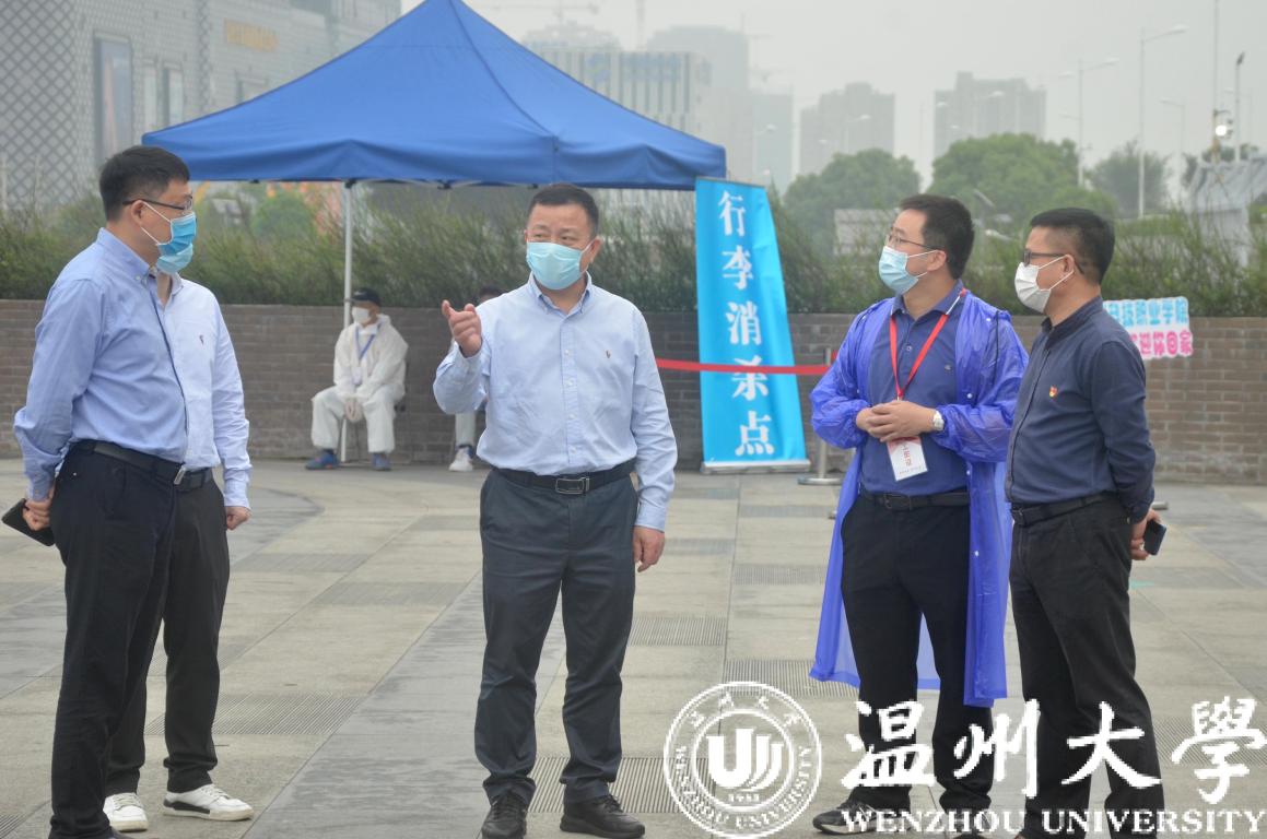5月7日,校党委书记谢树华来到亚洲无码 设在温州动车南站等处的接待点、消杀点和报到点,对报到和接站流程进行检查,并亲切慰问返校学生和接站工作人员。