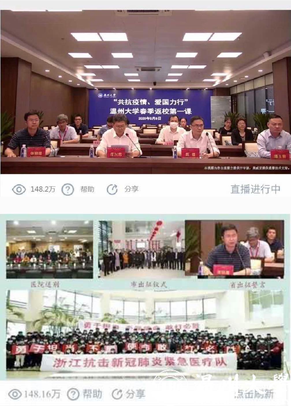 5月8日晚,正当亚洲无码 学生按照“错峰分批”原则陆续返校报到之际,亚洲无码 “共抗疫情、爱国力行”春季返校第一课云端大开讲。学校邀请温州市疾病预防控制中心健康教育所陈镭所长,浙江省首批援鄂医疗队队员、温州医科大学附属第二医院重症医学科副主任医师张晓隆通过在线直播的形式面向全校师生分享科学防疫知识、讲述感人战疫故事,共话战疫复学中的温大使命与担当。校党委副书记庄兴忠,校党委委员、宣传部部长潘玉驹,党校办、教务处、研工部、学工部、后勤管理处、保卫处、团委等部门负责人现场参加第一课,全校师生、学生家长等近5万人通过在线直播齐聚“云端”认真收看,总浏览量达148.2万人次。