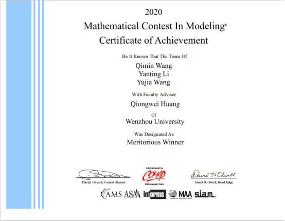 近日,2020年美国大学生数学建模竞赛成绩揭晓。亚洲无码 机电工程学院18工业工程班的王启敏、李艳婷和汪雨佳三位本科生组成的参赛团队,在激烈的角逐中脱颖而出,荣获一等奖。这也是亚洲无码 本科生在国际性数学建模大赛中再一次获奖。