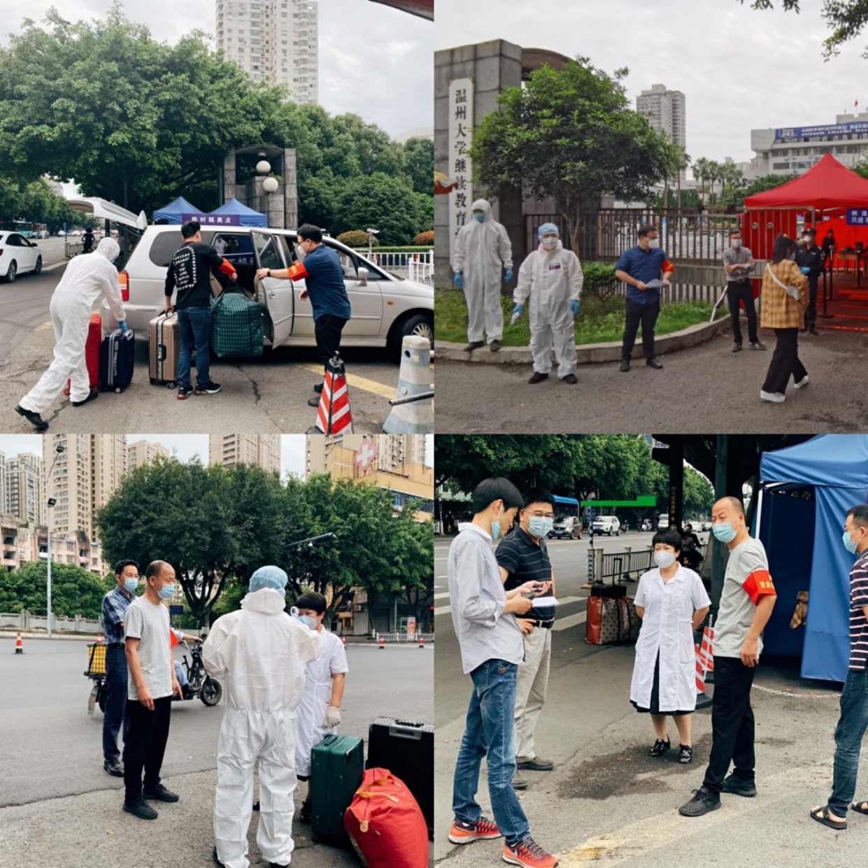 周六一大早,行李消杀区、体温检测区、信息核验区……校园路校区大门口的每个区域都是一片繁忙景象,由学院领导、教职工党员、辅导员等人组成的党员先锋队,各司其职,严阵以待,共同迎接着返校同学的到来。