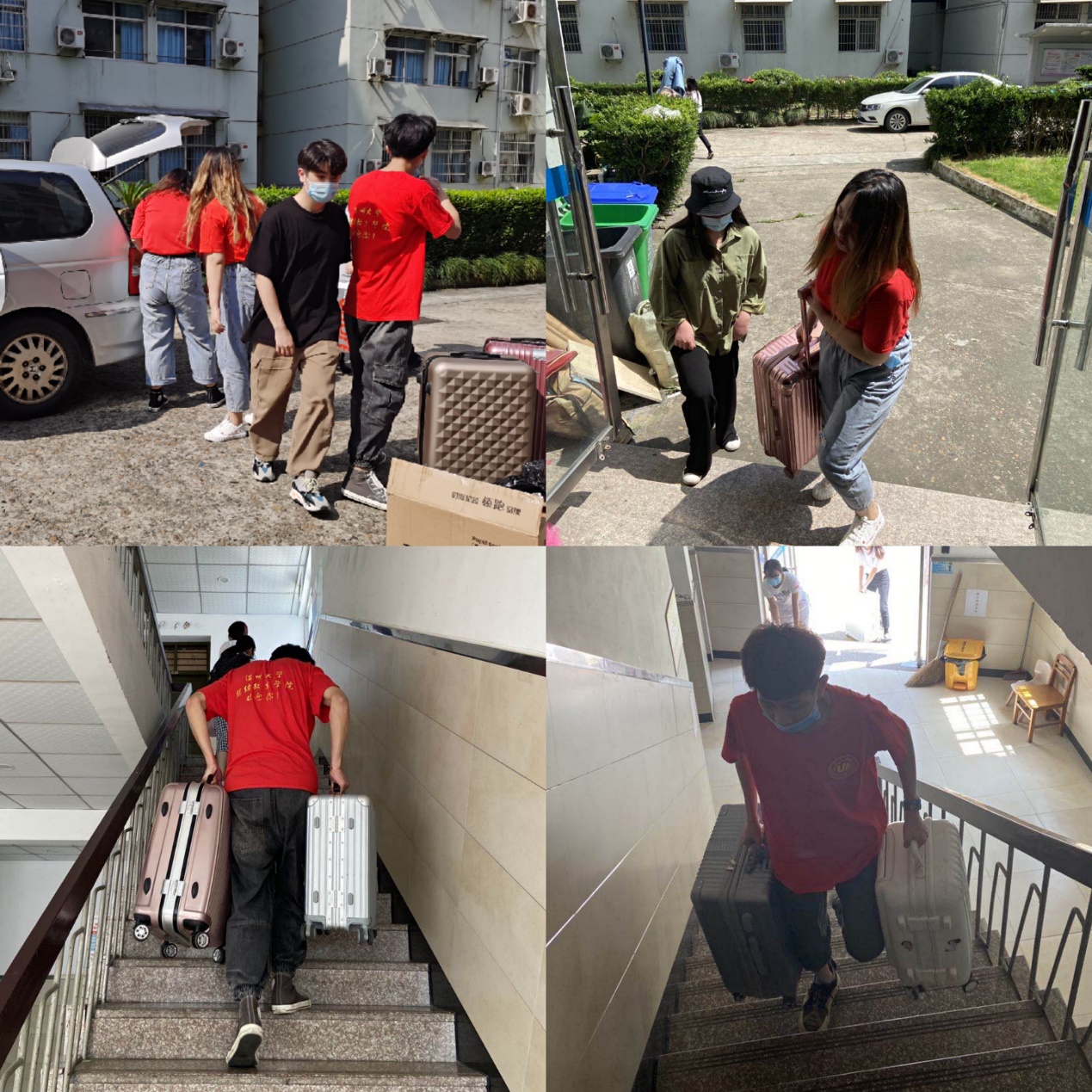 毫无疑问地,我们的党员先锋队上!党员先锋队临时征用了学院的两部通勤车辆,承担起从校门口到公寓区的行李运送工作。行李送达公寓区后,又面临着搬上楼的重任,于是我们的学生党员、入党积极分子也加入到党员先锋队的行列——有的行李一趟搬不完我们就来回两趟;有的楼栋人手不足,女生也加入“战场”……从栋2楼到栋6楼,从一层到六层,党员先锋队干得热火朝天,大汗淋漓,有的党员半天下来,单单跑楼梯就2万多步了!但是当听到同学们那句发自肺腑的“谢谢您”和“老师(同学)辛苦了”时,这一切又显得那么值得,那么有意义!