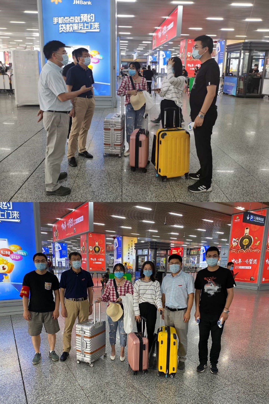 第一位出站的是来自金华地区、19中韩班的张同学,党员先锋们早早地等候在出站口迎接。经过党员先锋队一系列严格的体温检测、行李消杀和返校登记后,由学院专车将其“一站式”接送回校。