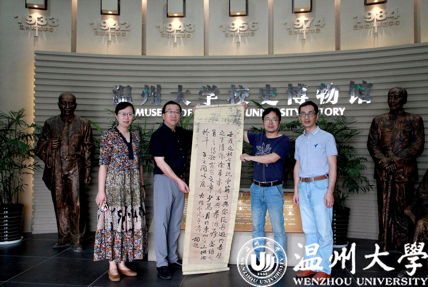丁海涵老师长期关注温州地方文史和学校人文历史,对温州近代艺术教育颇有研究。这次捐赠的胡定侯先生作品,是其在“微拍堂”上发现的。经鉴定,确为胡定侯先生真迹,迅即拍下,捐赠给校史馆珍藏。蔡曙光校长代表学校向丁海涵老师表达了谢意。