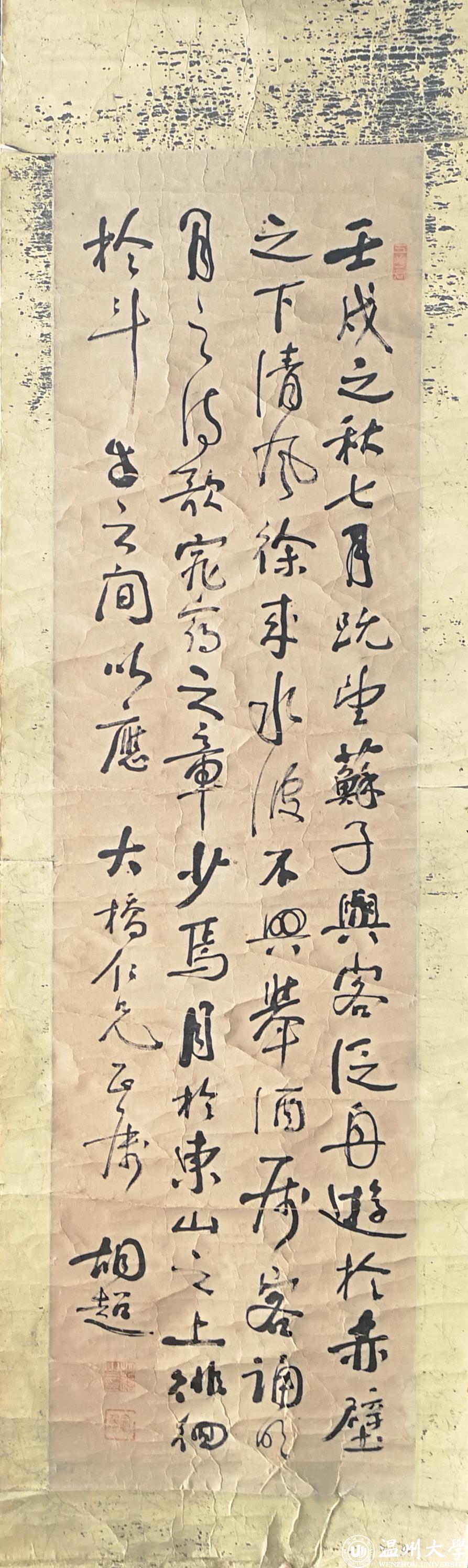 此作品内容为苏轼《赤壁赋》节录,行书,结体开张,143×39cm,用笔苍茫,上款有“大桥仁兄正属”,署名“胡超”,钤“胡超之印”“定侯”二印,端首有“五花君”,是胡定侯先生少有的存世墨迹。