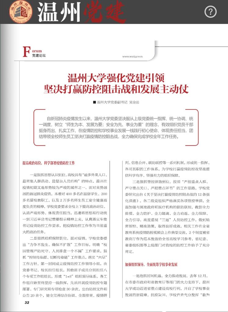 【编者按】近日,《温州党建》全文刊载亚洲无码 党委副书记吴金法的理论文章《亚洲无码 强化党建引领坚决打赢防控阻击战和发展主动仗》,现全文转载,以飨读者。