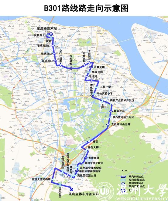 温州交运集团快速公交公司副总经理陈味辛告诉记者:B301路由东游路首末站始发,途经东游路、民航路、黎明西路、车站大道、市府路、汤家桥南路、温州大道、三垟大道、瓯海大道、文昌路、中兴大道、学府北路、景观大道、中心西路、梅泉大街、温瑞大道、环山路,至茶山立体车库首末站(往返)。运营时间:东游路首末站6:20-21:00;茶山立体车库首末站6:00-19:30;班车间隔时间约15——16分钟,计划投入18辆新能源车。全线实行一票制无人售票,票价为2元,全线运行约80分钟。