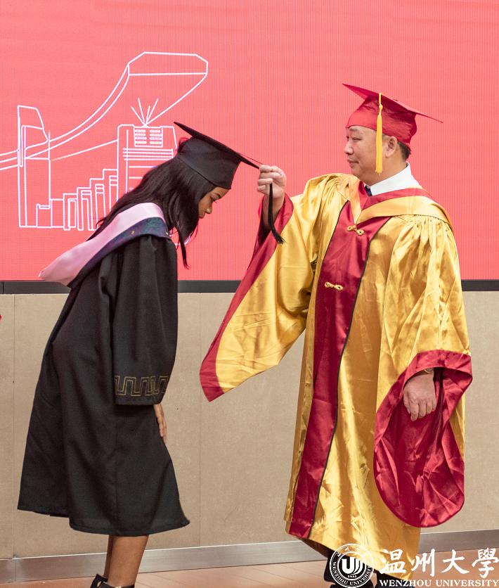 最后举行了隆重的学位授予仪式。赵敏校长为毕业生代表们颁发学位证书,并一一正冠、拨穗合影。稻穗的成熟代表着学有所成,从左到右,拔去的是大学的稚嫩与过往,拨来的是温大给每位学子的份份祝福与牵挂。