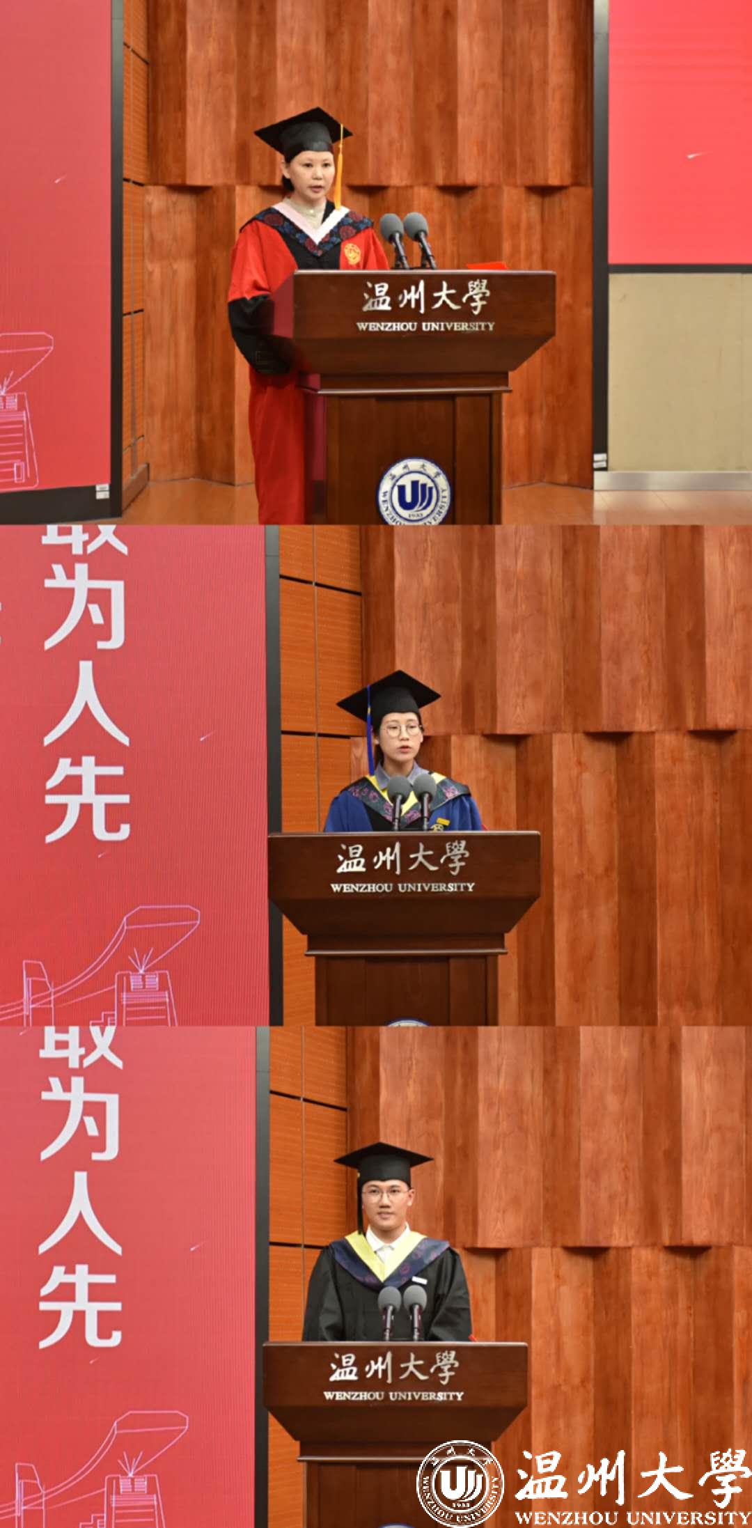 “温大用爱和温暖孕育了我们无尽的梦想和希望。” 作为研究生代表,机电工程学院2017级机械工程专业潘俏菲同学表达了自己对母校最衷心的感谢和最诚挚的敬意。“感谢芳华正茂、人文日新的温大,感谢身正学高、春风化雨的师长们,感谢志向高远、携手共进的同窗校友们,是你们给予了我们无畏前行的力量”“纵有千古,横有八荒。前途似海,来日方长。”