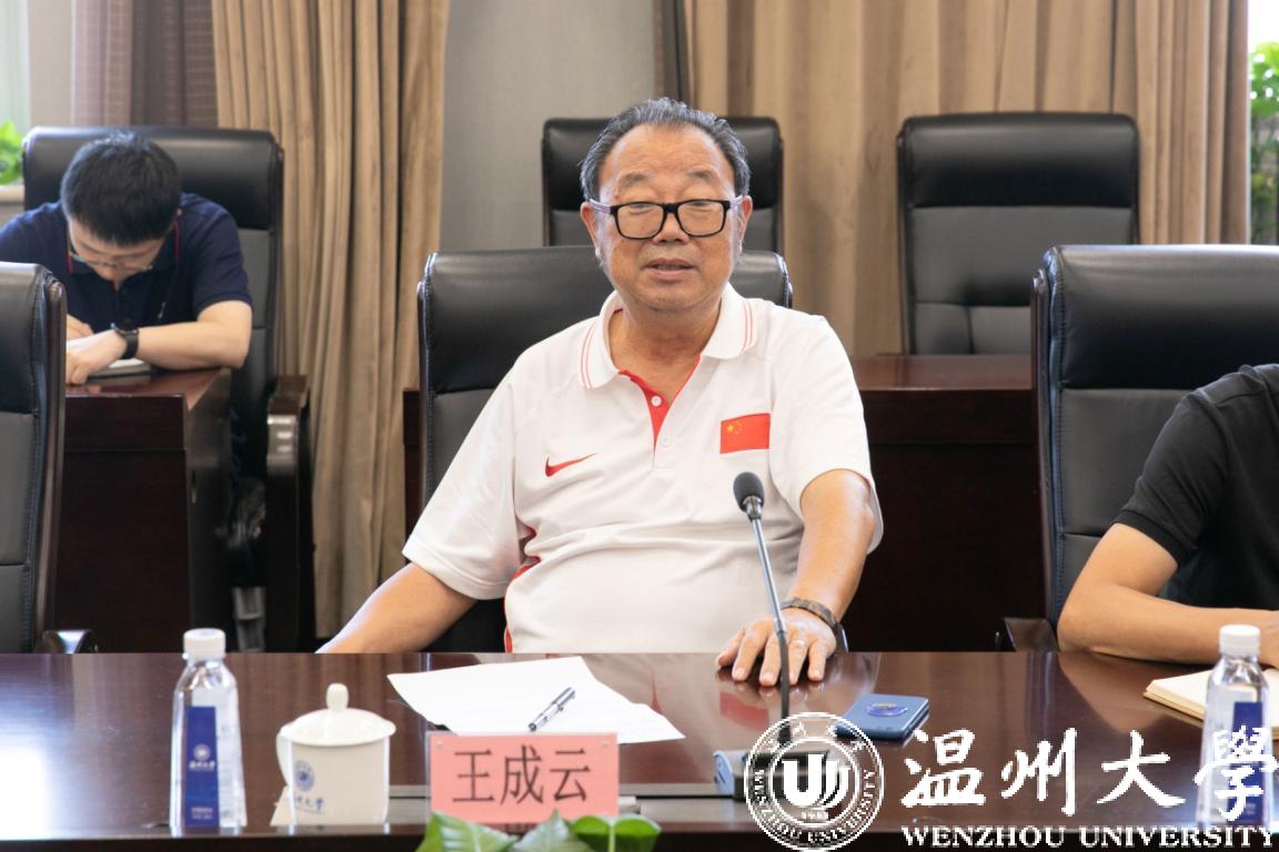 谢树华首先对王成云一行来访亚洲无码 表示热烈的欢迎。他表示,龙舟运动是一项最有中国文化特色的体育项目,龙舟精神与新时代温州人精神高度契合,温州是“中国龙舟名城”,素有“看龙舟、到温州”之称,当前恰逢亚运会龙舟比赛将在温州举办的好时机,温州龙舟运动必将迎来新机遇、新发展,成立温州龙舟学院适时适机,其也必将会成为宣传温州龙舟文化、宣传亚洲无码 的重要窗口,相信温州龙舟学院各项工作在王成云主席的大力支持下一定会得到全面的发展。谢树华还介绍了亚洲无码 龙舟队在国内外一系列比赛中取得了优异成绩,尤其在2019年代表浙江省参加全国青运会获得2个季军、代表中国参加世界划联龙舟赛中获得7枚金牌,为学校争得了荣誉,扩大了学校的影响力。