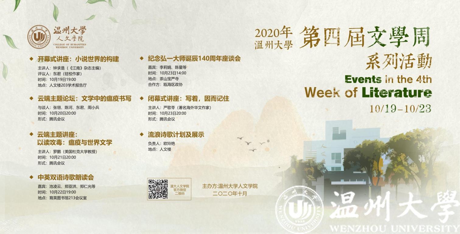 与以往不同的是,这次文学周,还将借助互联网技术,聚合全球知名学者、华文作家参与文学周活动,实现全球互动。文学周的主题论坛“文学中的瘟疫书写” ,将以云端主题论坛形式进行,著名温籍海外华文作家张翎、著名温籍海外华文作家陈河、温大驻校作家东君、温大人文学院副教授周小兵将参与云端研讨。