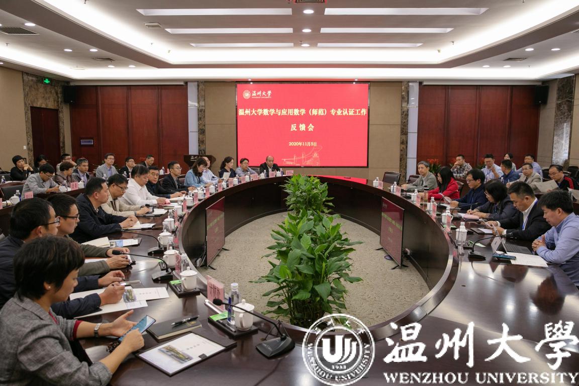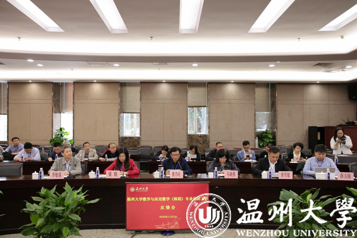 11月5日下午,经过认证专家组3天高强度的现场考查工作,亚洲无码 数学与应用数学专业师范类第二级专业认证专家意见反馈会在岩松堂白鹿厅举行。本次认证由淮南师范学院原校长曹杰旺教授担任专家组组长,组员有泰山学院数学与统计学院院长马晓燕教授、浙江师范大学教师教育学院副院长黄晓教授、湖州师范学院理学院党委书记唐笑敏教授、浙江省教育厅教师工作处原调研员李敏强。浙江省教育考试院项目管理员薛玉刚全程陪同。