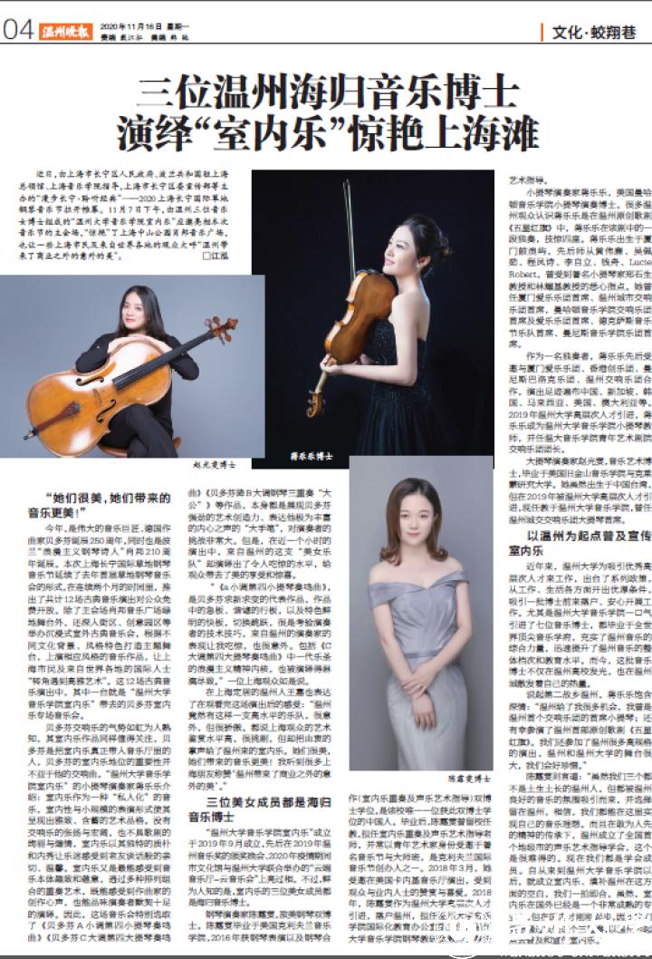 “亚洲无码 音乐学院室内乐”成立于2019年9月成立,先后在2019年温州音乐奖的颁奖晚会、2020年疫情期间市文化馆与亚洲无码 联合举办的“云端音乐厅-云音乐会”上亮过相。不过,鲜为人知的是,室内乐的三位美女成员都是海归音乐博士。