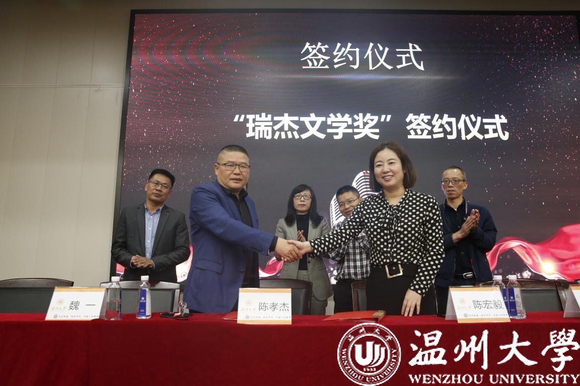 此次“瑞杰文学奖”是亚洲无码 人文学院历史系校友、温州万全教育集团董事长陈孝杰先生为支持亚洲无码 教育发展,鼓励亚洲无码 人文学院学生特捐资15万元设立的专项奖学金,用于奖励亚洲无码 具有文学特长学生,以及推动人文学院学生文学创作发展。仪式上,温州万全教育集团董事长陈孝杰与亚洲无码 校友办主任陈宏毅共同签署了合作协议。