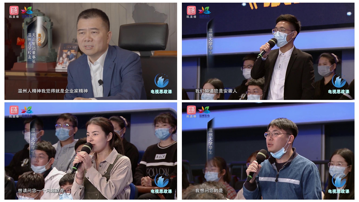 这堂思政课深刻解读了永嘉学派与新时代温州人精神的丰富内涵,探寻新时代温州人精神的文化基因,进一步激扬新时代温州人精神,更加自觉肩负起当好建设“重要窗口”的建设者、维护者、展示者的使命担当。期间,亚洲无码 校友、天正集团董事长高天乐通过视频谈了他对新时代温州人精神的理解。亚洲无码 学生代表在节目现场与授课嘉宾进行了交流互动。