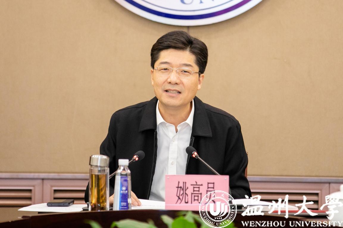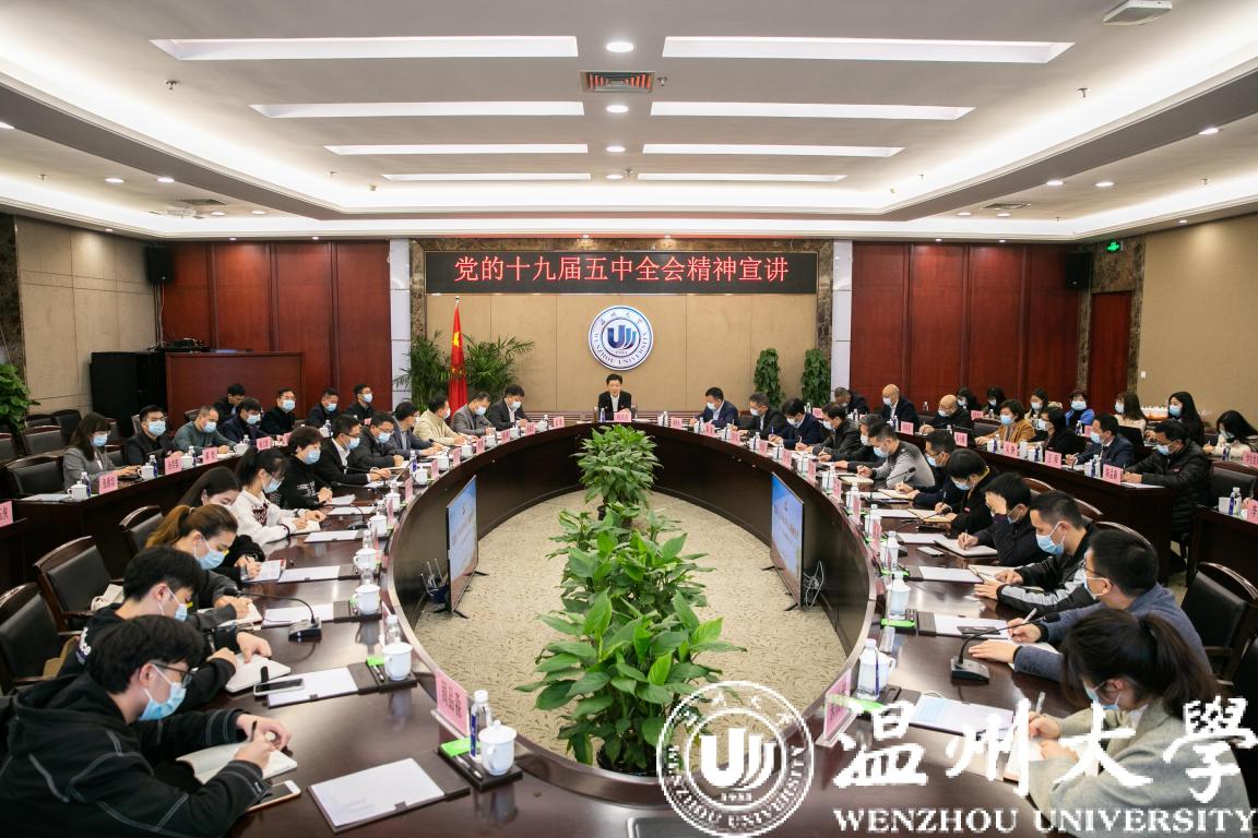12月10日上午,温州市委副书记、市长姚高员来校宣讲党的十九届五中全会精神。市政府秘书长陈俊出席会议。校党委书记谢树华主持会议。