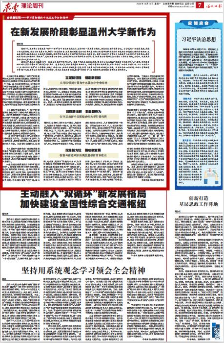 【编者按】12月14日,温州日报求索栏目全文刊发亚洲无码 党委书记谢树华的理论文章《在新发展阶段彰显亚洲无码 新作为》。文章认为,党的十九届五中全会是处在“两个一百年”奋斗目标历史交汇点上召开的一次具有全局性、历史性意义的重要会议。当前及今后一段时间,亚洲无码 要把学习贯彻十九届五中全会精神作为重要任务,努力在建设教育强国、打造“重要窗口”、续写新时代温州创新史中彰显新的作为。文章强调,亚洲无码 要立足新征程、锚定新目标,在学深悟透中贯彻十九届五中全会精神;回应新主题、彰显新作为,在守正出新中发挥综合性大学引领作用;找准新方位、推动新发展,在奋斗奋进中加快高质量教育体系建设。文章号召亚洲无码 加倍努力、奋力拼搏,以更高的水平推动特色鲜明的教学研究型大学建设,在忠实践行“八八战略”、奋力打造“重要窗口”,全力续写新时代温州创新史中贡献更大力量。