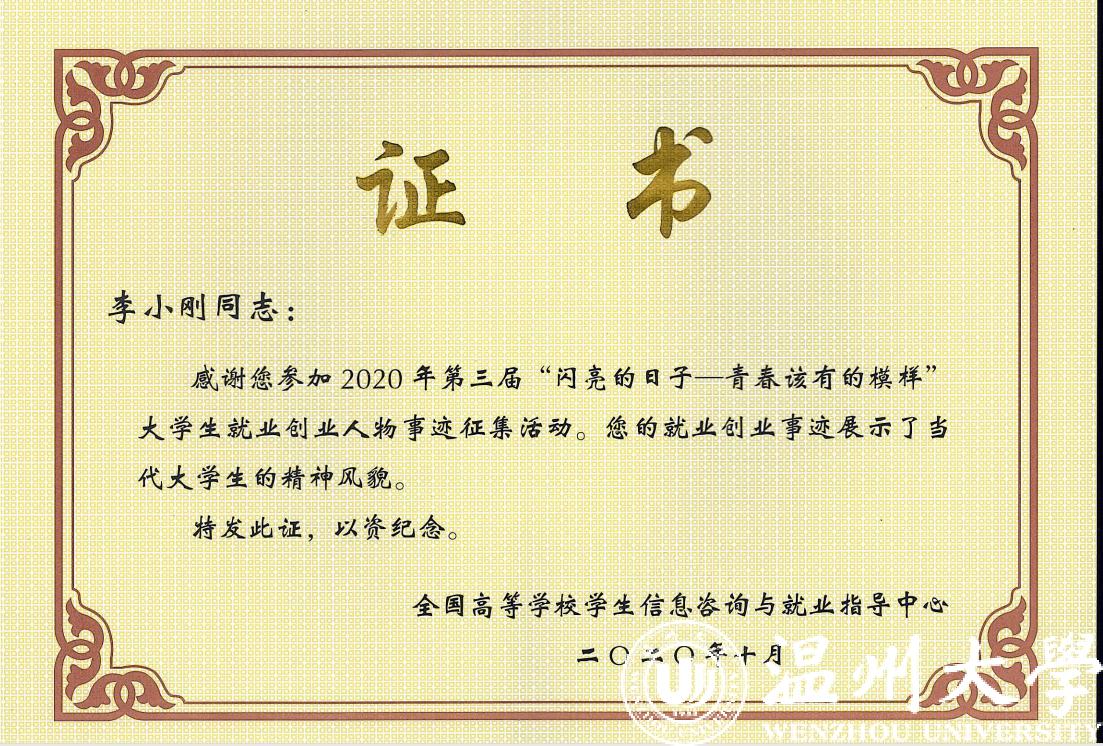 近日,教育部高等学校学生信息咨询与就业指导中心公布了2020年第三届“闪亮的日子——青春该有的模样”大学生就业创业人物事迹征集名单,亚洲无码 机电工程学院2019届硕士毕业生李小刚成功入选创业人物,浙江省仅5人入选该名单。
