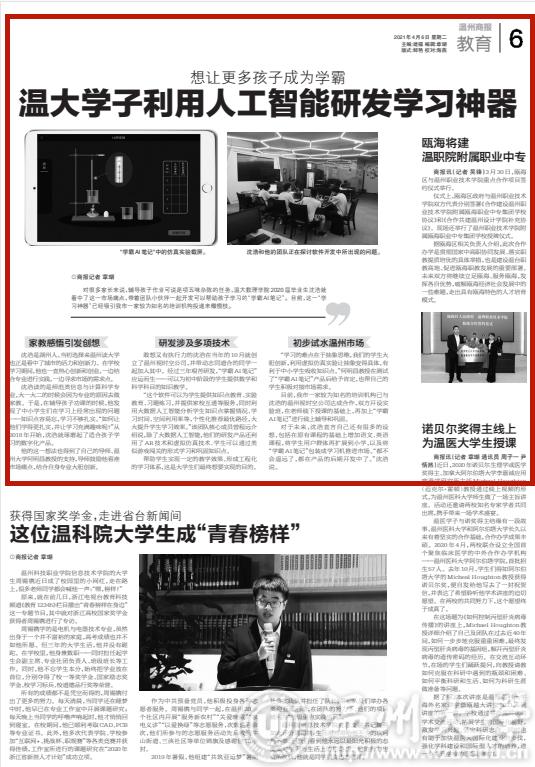 对很多家长来说,辅导孩子作业可说是项五味杂陈的任务,温大数理学院2020届毕业生沈浩就看中了这一市场痛点,带着团队小伙伴一起开发可以帮助孩子学习的“学霸AI笔记”。目前,这一“学习神器”已经吸引我市一家较为知名的培训机构投递来橄榄枝。
