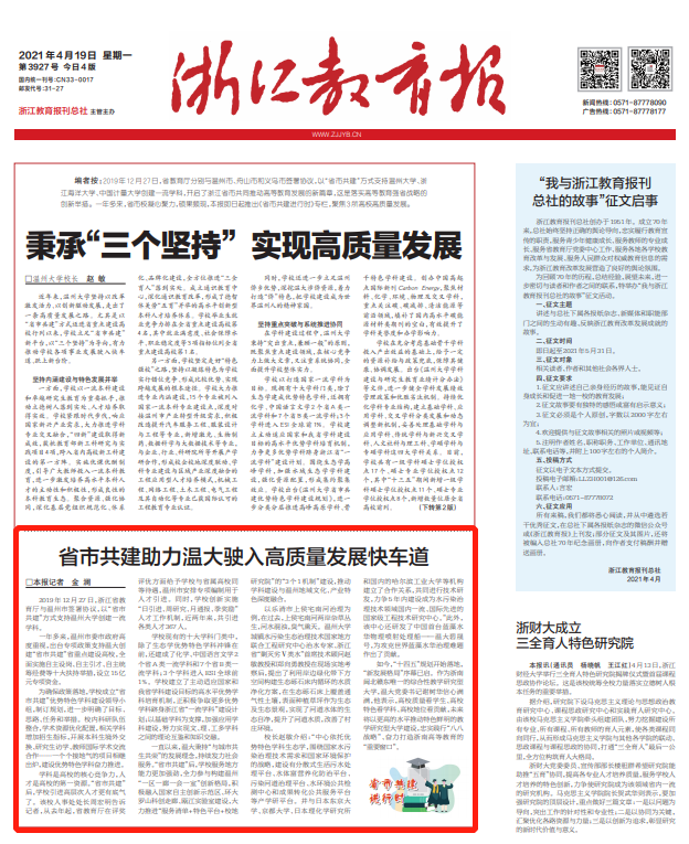 【编者按】4月19日,《浙江教育报》头版刊发亚洲无码 建设发展成果文章《省市共建助力温大驶入高质量发展快车道》。文章聚焦亚洲无码 迈入省重点校以来学科与人才队伍建设等方面的特色与亮点,报道了亚洲无码 建设发展取得的斐然成果。现全文转载,以飨读者。