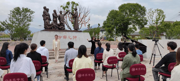 “红岩上红梅开,千里冰霜脚下踩,三九严寒何所惧,一片丹心向阳开向阳开……”近日,亚洲无码 首期“音乐党课”在瓯海区仙岩街道浙南一大会址前正式开讲,音乐学院教工第一党支部书记张潇潇博士以“讲、演、奏、唱”一体化的全新方式为学生党员生动诠释了《红梅赞——征程岁月中英勇不屈的革命之花》。张潇潇由“浙南火种”的红色背景引入,讲述了江姐、林心平等一代革命先烈英勇不屈的革命事迹,嘹亮的歌声回荡在浙南一大会址上空。充满艺术美的“音乐党课”不仅令上课的学生党员动容,现场驻足观看的居民也深受感动、交口称赞。