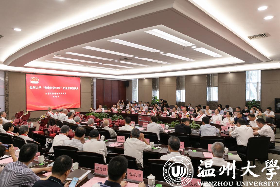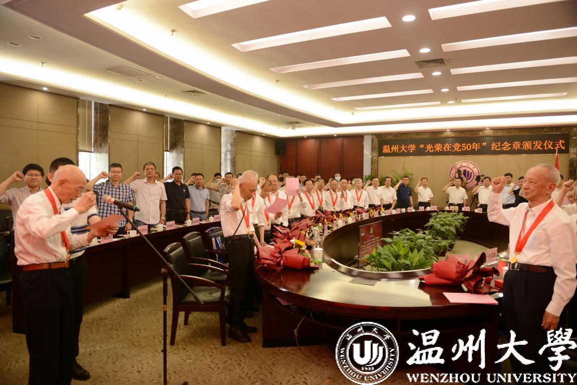 校党委书记谢树华逐一为老党员颁发“光荣在党50年”纪念章,并与他们亲切握手、真挚慰问,表达对老党员的崇高敬意。他希望学校各级党组织和广大党员以纪念章颁发为契机,深入推进党史学习教育,持续掀起向老党员学习的热潮,主动向先进看齐、向榜样看齐,在学校高质量发展新征程中,担当作为、奋发奋进、出力出彩。青年学生党员向老党员献上鲜花,现场响起阵阵热烈的掌声。老党员们手捧纪念章,心潮澎湃、百感交集,自豪之情溢于言表。