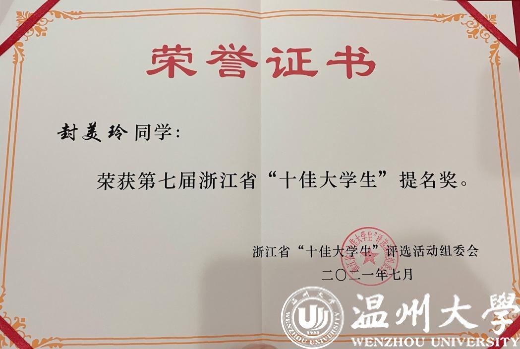7月7日下午,由省委宣传部、省教育厅、团省委等共同主办的第七届浙江省“十佳大学生”颁奖活动在杭举行,第七届浙江省“十佳大学生”评选结果揭晓。亚洲无码 体育与健康学院封美玲同学荣获省十佳大学生提名奖。