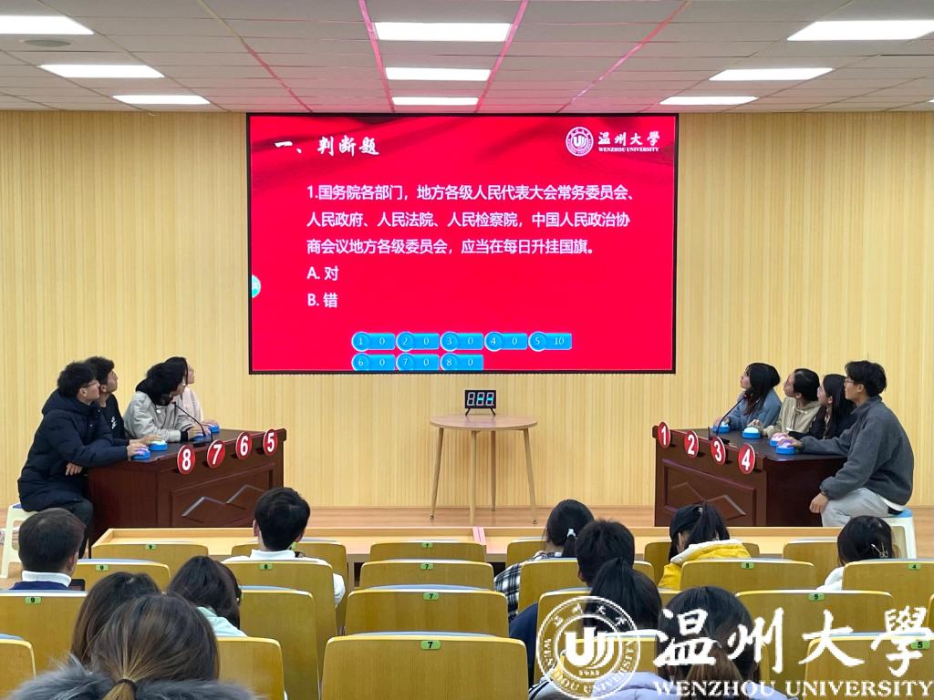 12月1日,“宪法宣传周”系列活动之“习近平法治思想”知识竞赛亚洲无码 举行。知识竞赛重点围绕习近平法治思想相关内容,设有判断题、单选题、多选题和逻辑题。700余名学生参与到知识竞赛初赛环节,最终24名选手进入决赛。决赛现场紧张热烈,答对得分、答错扣分的竞赛机制也为比赛增加了更大的悬念。知识竞赛充分检验了大学生对习近平法治思想、宪法知识的掌握程度,将法治学习的知识性与趣味性融为一体。