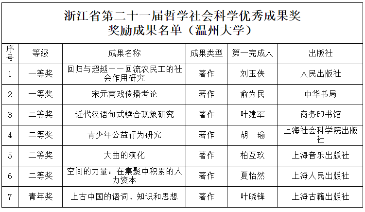 据悉,浙江省哲学社会科学优秀成果奖为浙江省哲学社会科学类成果最高奖,是检阅、展示浙江省哲学社会科学发展成果的重要平台。优秀成果奖每两年评选一次,列入省人民政府表彰项目,获奖成果由省人民政府颁发证书并给予奖励。获奖成果在传承发展优秀传统文化,服务文化浙江建设和浙江经济社会发展等方面都发挥了重要作用,彰显了浙江学者深厚广博的学养、严谨求实的学风和勇于创新的精神。