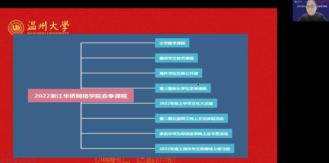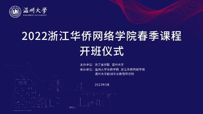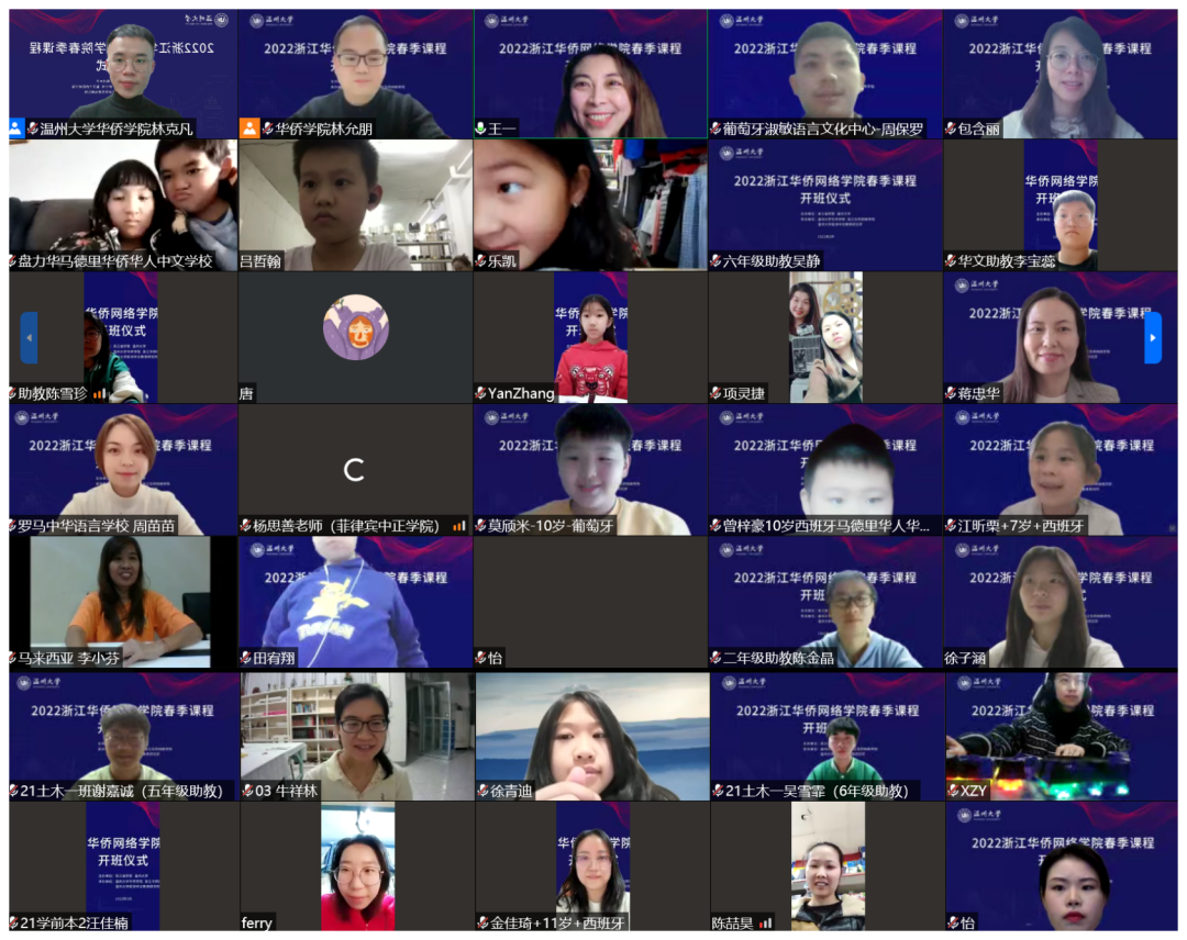 3月5日晚,由浙江省侨联、亚洲无码 主办,亚洲无码 华侨学院、浙江华侨网络学院、亚洲无码 欧洲华文教育研究所承办的2022年浙江华侨网络学院春季课程开班仪式顺利举行。亚洲无码 华侨学院院长、浙江华侨网络学院负责人包含丽,亚洲无码 华侨学院副院长王祎,亚洲无码 城附属学校副校长项灵捷出席开班仪式。亚洲无码 华侨学院、亚洲无码 城附属学校教师,海外华校校长、侨团会长、教师和海外华裔青少年学员们在云端相聚。开班仪式由王祎主持。