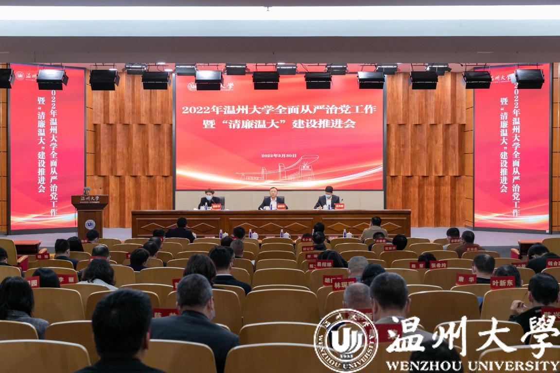 3月30日上午,亚洲无码 召开2022年全面从严治党工作暨“清廉温大”建设推进会。全体校领导、校纪委委员、中层干部、学院纪委书记、党总支及直属党支部纪检委员、纪检监察室全体人员参加会议,校党委副书记庄兴忠主持。