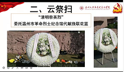 响应温州市“奋进2022·清明祭英烈”活动倡议,崇尚英雄、学习英雄、关爱英雄,传承英雄烈士精神,4月5日上午,亚洲无码 马克思主义学院教工第一党支部、行政党支部和研究生第二党支部联合举办清明节“网上祭英烈,踔厉思奋进”主题党日活动,表达对革命英烈的敬仰和哀思之情。