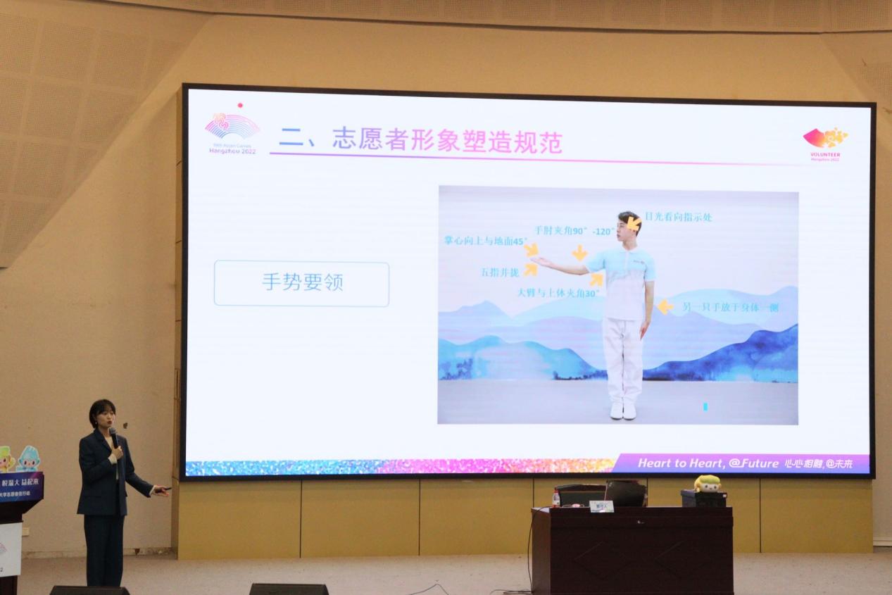 “礼仪,是一封无言的介绍信。”在《志愿服务礼仪培训》中,国家高级礼仪师、亚运会志愿者培训师蔡可人以志愿服务礼仪的平等、尊重、宽容、适度、自律基本原则为切入点,讲解了志愿者的仪容仪表仪态及文明用语规范。在讲解的过程中,老师请全场志愿者起立,从坐姿、站姿等仪态要求,进行互动和矫正,叮嘱志愿者要勤练,将服务意识外化于行。