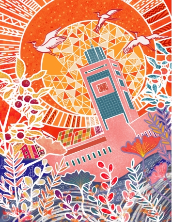 爱学校,携手共建美丽校园。“我的作品主要采用了亚洲无码 周边的植物,包括银杏、杨梅树和一些叫不出名字但经常会出现的树,截取小部分元素在画面下半部分作为装饰和铺垫。上半部分加上温州当地田野经常出现的动物白鹭,画面中心主题是亚洲无码 的图书馆建筑,图书馆前下半部分有较为抽象的河流与土地,上面有小鱼等等。整体的环境和动植物将图书馆紧紧围绕,背景是一个巨大的抽象太阳,后面还有小部分太阳能板和小型房屋建筑,主要体现人与自然和谐共生,将所有元素融合在一起,并用暖色调来进行色彩搭配,表现珍爱地球的主题。”马芳芳同学介绍了自己的作品。