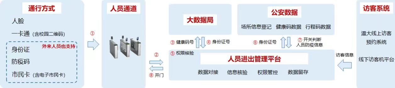 人员(含外来人员)在通过闸机时,可以通过刷脸、校园卡/电子校园卡、身份证、防疫码和市民卡/电子市民卡等多种方式来进行身份核验,其中防疫码和市民卡的身份核验是通过大数据局和社保局的数据接口来进行的。系统在该人员身份核验成功后会通过公安数据接口获取公安放行权限信息,并根据该信息控制闸机开关,同时向公安返回场所码数据。此外,系统在记录人员进出信息的同时,还会记录其防疫码状态等相关信息,形成校园进出电子化存档,在必要时可用于事后筛查等工作。
