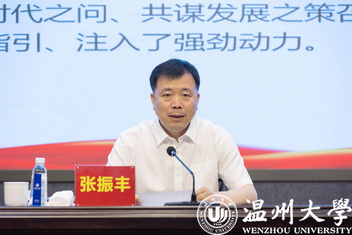 张振丰结合报告原文和温州改革发展实践的一组组案例、数据,依次从“全省第三极”“创新制胜”“大都市区”“文化繁荣”“共同富裕”五个关键词出发,解读了省党代会给温州发展带来的机遇和利好。张振丰指出,一座充满创新活力的城市,背后总是闪耀着大学的光芒,温州做强“全省第三极”,教育是重要支撑,亚洲无码 是重要力量。张振丰希望亚洲无码 时刻牢记习近平总书记殷殷嘱托,认真贯彻落实省党代会精神,抢抓新机遇、彰显新担当、展现新作为,奋力推动大学与城市共生共荣、携手并进,为温州当好“两个先行”的开路先锋发挥更大作用。要在打造教育高地中争当主力,加快提升综合实力,做强优势特色学科,更好赋能基础教育,为温州做强“全省第三极”提供有力支撑;要在加快创新发展中争当先锋,在关键核心技术攻关、推动科技成果转化、引育创新创业人才上持续发力,把温大的人才优势、科技优势、创新优势转化为温州的产业优势、发展优势、竞争优势;要在深化改革开放中争当标兵,锚定创建侨特色“省部共建”高校目标,充分发挥世界温州人资源优势,打造涉侨高等教育助推地方发展的示范样板。