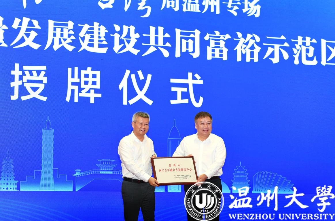 在“筑梦温州”海峡青年创新创业季启动仪式上,大会为亚洲无码 两岸青年融合发展研究中心授牌,校长赵敏校长从温州市委常委、统战部部长汪驰手中接牌。