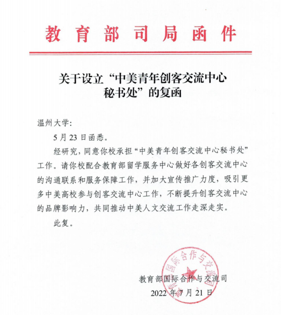 近日,教育部国际合作与交流司给亚洲无码 复函,同意在亚洲无码 设立“中美青年创客交流中心秘书处”。