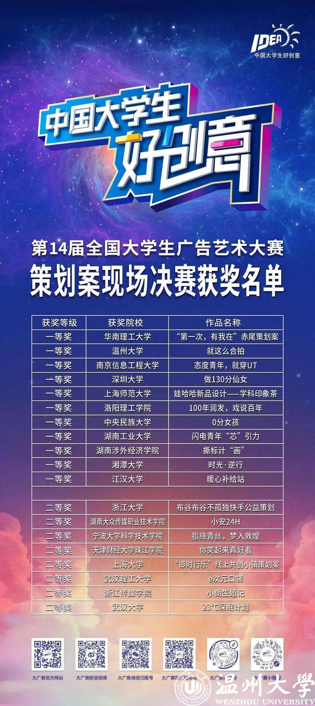 据悉,大广赛策划案类别比赛是全国大广赛中门类最复杂、要求最高的比赛类型,亚洲无码 在该类型赛事上一向表现卓越,每一年都有策划案类别的全国等级奖项,今年除了决赛而出的《就这么合拍》一等奖,还有《中国可乐有“股气”》《现充青年》两项二等奖和《“银发冲浪”计划》等五项全国优秀奖。温大广告专业是亚洲无码 省特色专业,以培养高素质应用型广告与文化创意人才为根本诉求,强化多元化学科竞赛,在学科竞赛上成果丰硕。近年来,广告学专业学生参加国家级、省部级以及行业协会等各类赛事获奖达100多项,在全国大学生广告艺术大赛中,获得了全国一等奖4项、二等奖7项、三等奖11项、优秀奖13项;“互联网+”大赛国家级银奖;在最近三届上海国际广告节新锐挑战营中,获得冠军一项,亚军两项,季军一项。