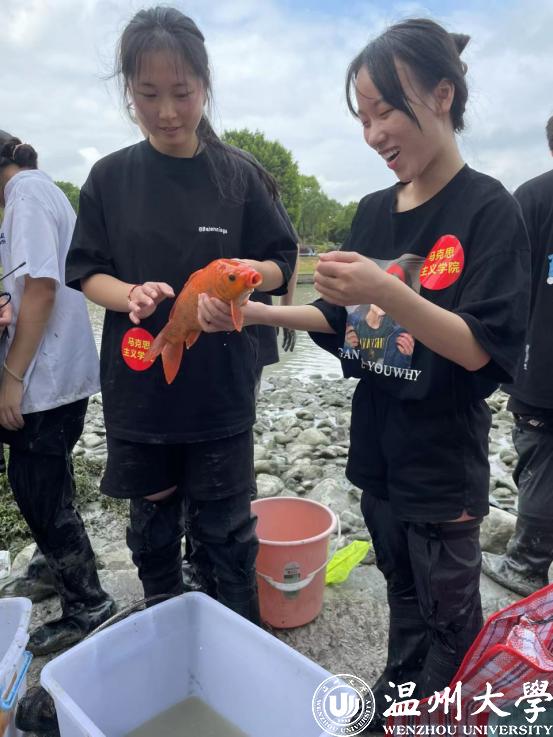 大闸一开,明心湖水缓缓下降,岸边的同学早已穿戴完备,跃跃欲试。随着一声“开鱼咯”,湖面瞬间热闹了起来,草鱼、罗非鱼等纷纷被同学们抓入篓中。